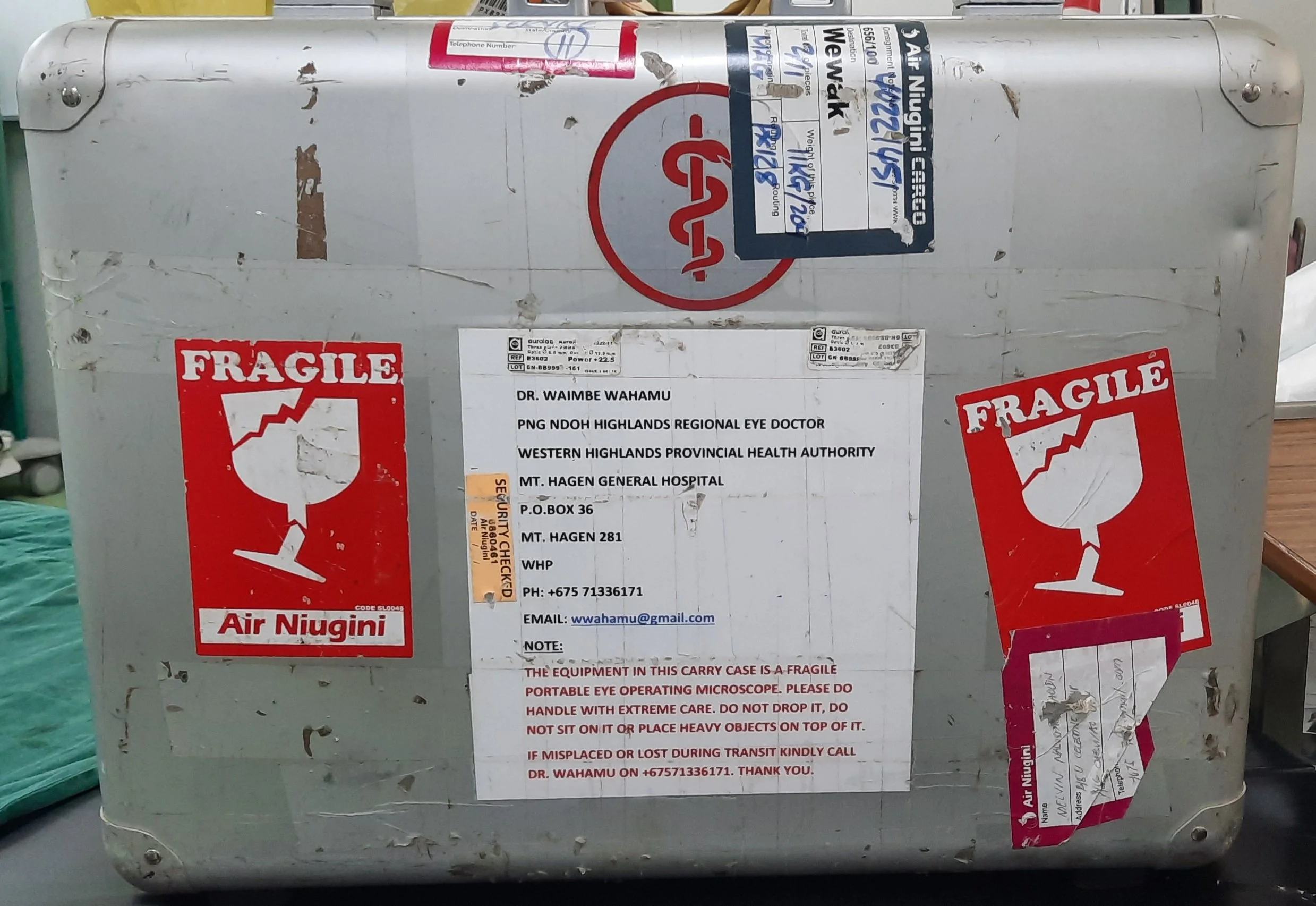 Beim wiederholten Umladen auf den Reisen zu den Outreach-Einsätzen in aller Welt müssen die Koffer nämlich einiges über sich ergehen lassen und entsprechend mitgenommen sehen sie dann mit der Zeit aus. Trotz alledem bleiben die Koffer intakt und der Inhalt sicher geborgen, womit die entscheidende Verfügbarkeit des Mikroskops für die Operationen stets gewährleistet ist.