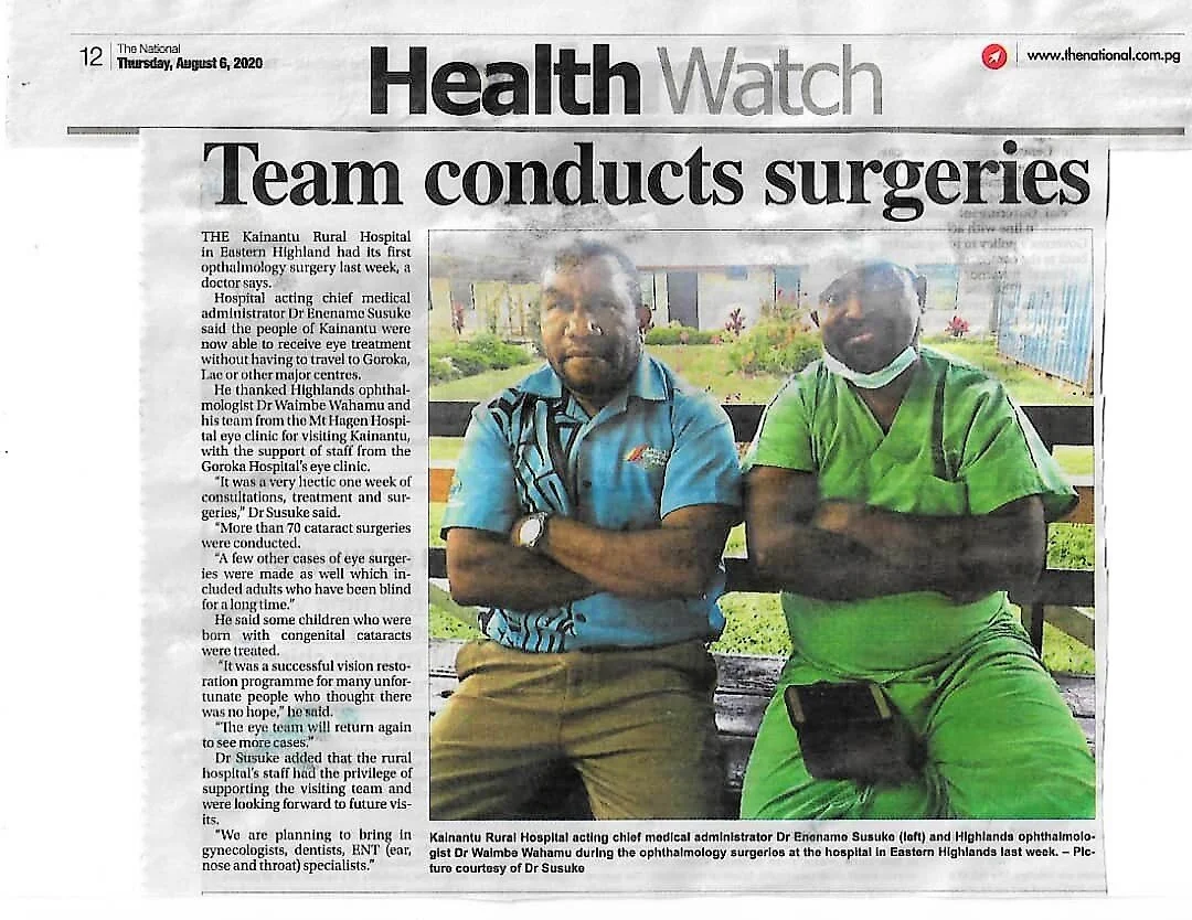 Die Zeitung „The National“ berichtet in ihrer Ausgabe vom 8. August vom ersten, einwöchigen OP-Einsatz am Hospital in Kainantu, Eastern Highland-Provinz, in der Dr. Wahamu neben weiteren Eingriffen 70 Katarakt-Operationen durchgeführt hat.